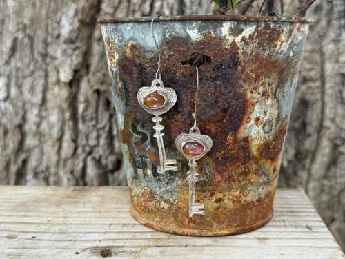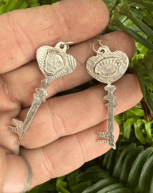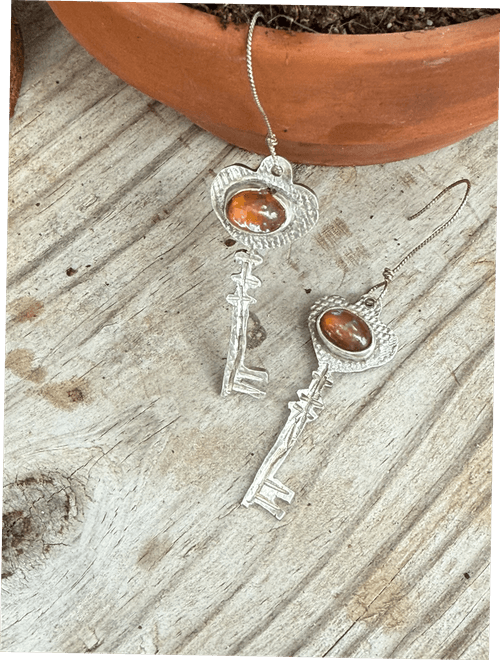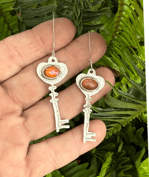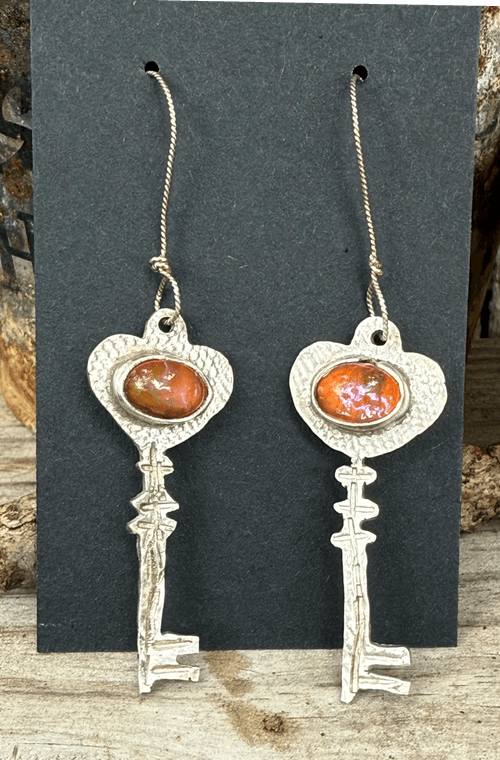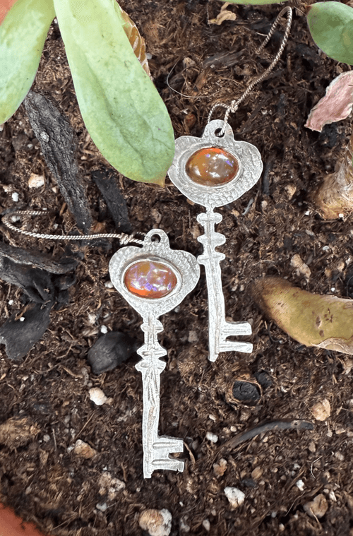 Unlock the fire within. These handcrafted fine silver earrings feature vintage-style key silhouettes, each crowned with a heart-shaped bow and a glowing Dragon’s Breath opal—an ethereal stone that flickers with hues of flame and spirit. Known for its fiery flash and elusive shimmer, Dragon’s Breath evokes ancestral magic and inner strength. The intricate key design symbolizes passage, protection, and the unlocking of sacred memory.