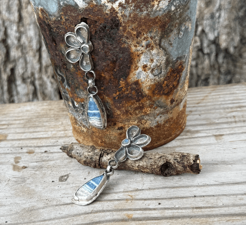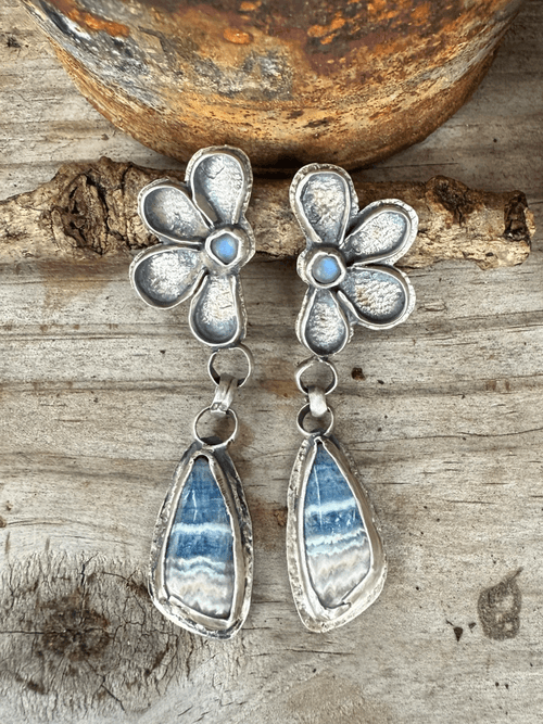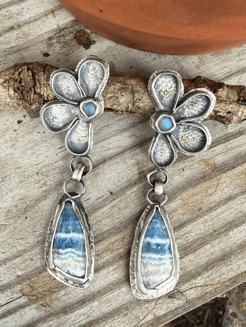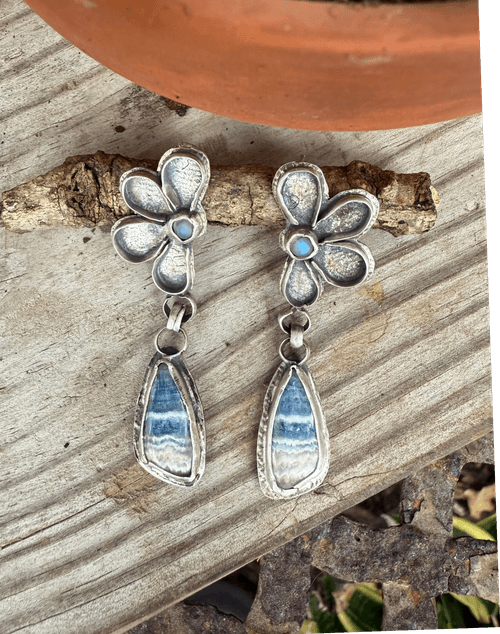A whisper of sky and spirit, these handcrafted earrings pair the grounding energy of blue rhodochrosite with the ethereal glow of rainbow moonstone. Each floral post cradles a moonstone like a drop of moonlight, while the teardrop-shaped rhodochrosite below shimmers with soft striations—like water flowing over stone. Set in fine silver, this design evokes resilience, renewal, and the quiet power of Cherokee women whose legacy lives in every detail.